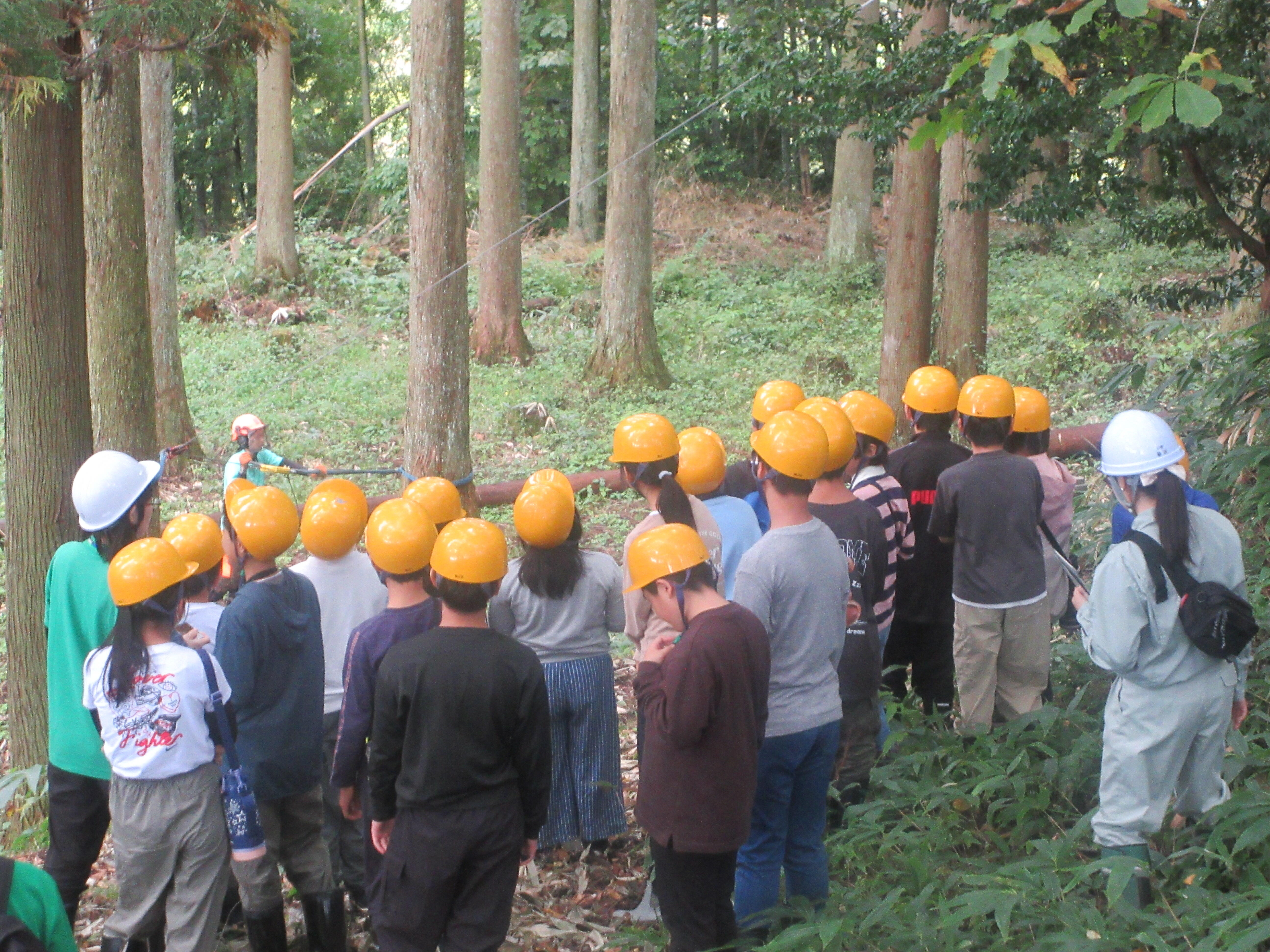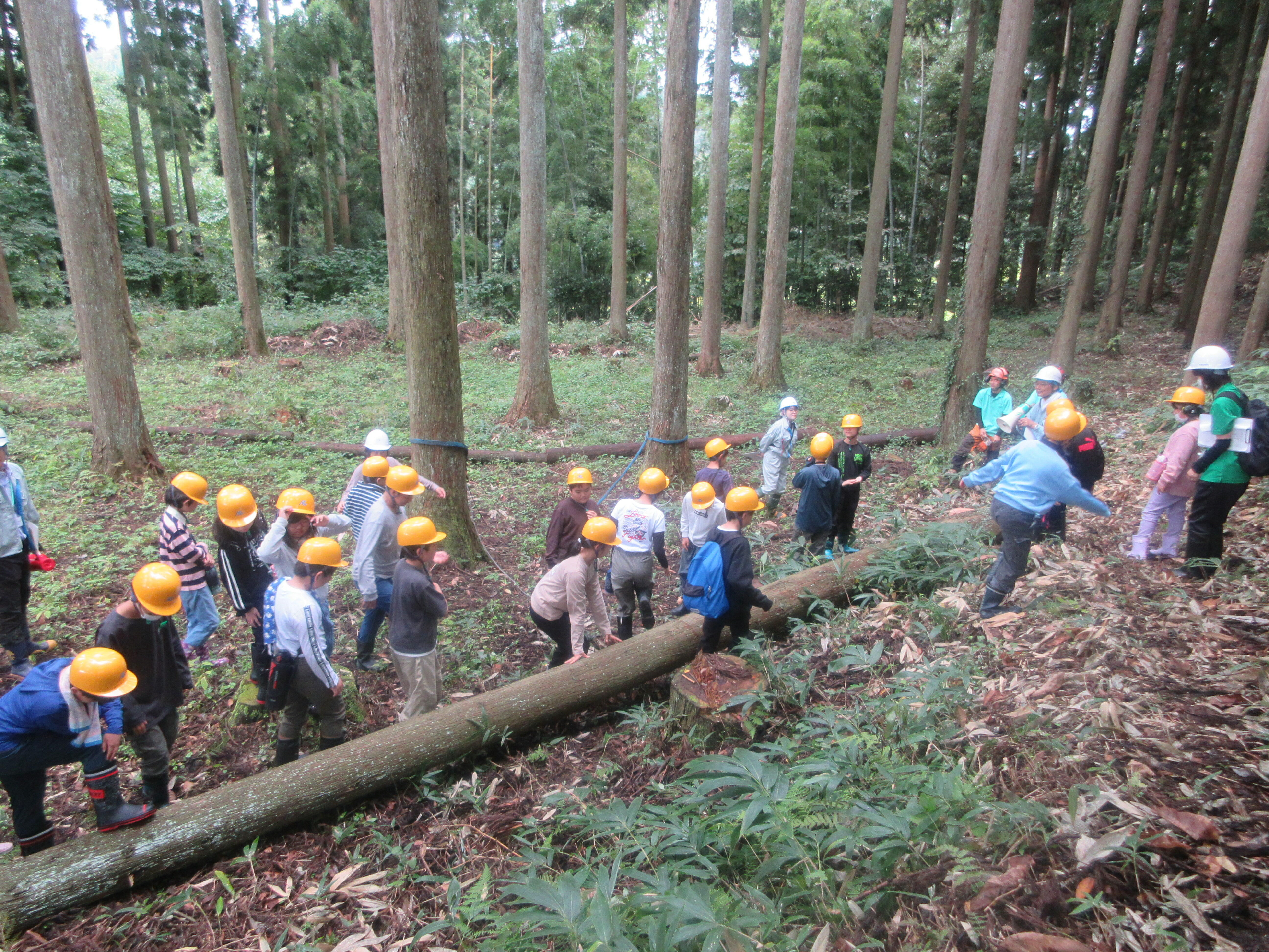 森林組合職員によるスギの伐倒を見学し、森の中に入り森の土の感触や匂い、伐ったスギの匂いなども感じてもらい、それぞれ自由に森の中を散歩してもらいました。