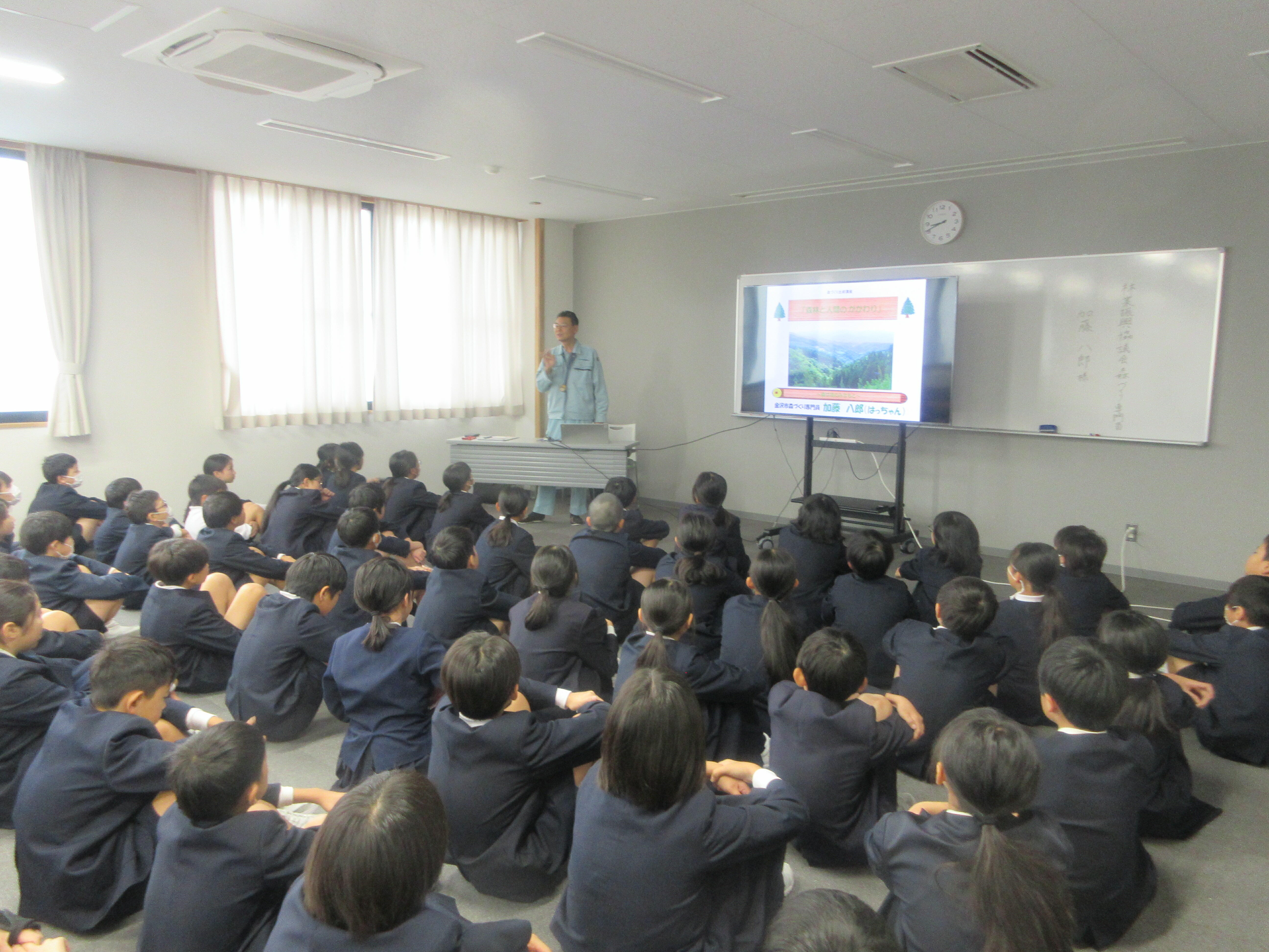 朝霧台小学校5年生90名を対象に教室で森の出前授業を行いました。明日は金沢テクノパークの森に出向き伐倒見学や植栽作業をする予定で、その事前準備として森のことについて学んでもらいました。